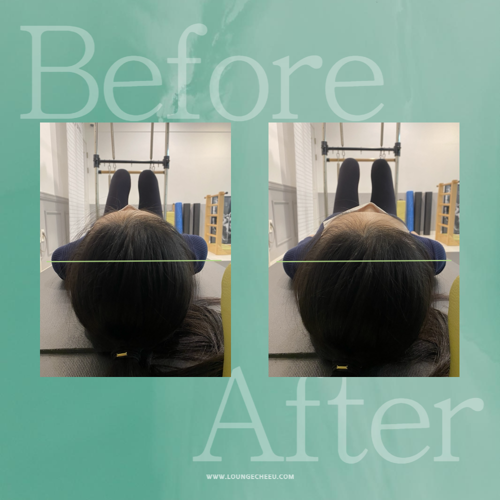 왼쪽의 비포 사진을 보시면, 가장 도드라지는 부분이 고개가 앞으로 많이 나가있는 모습이었어요. 그리고 전체적으로 무게중심이 앞으로 쏟아져있는 형태입니다. 그래서 첫번째 목표를 체중심을 뒤로 가져오는 것으로 삼아 운동을 진행하였습니다. 목과 골반의 변형을 바로 잡고, 코어와 등의 인지하는 동작 위주로 주2회, 총 10회 운동하였습니다.